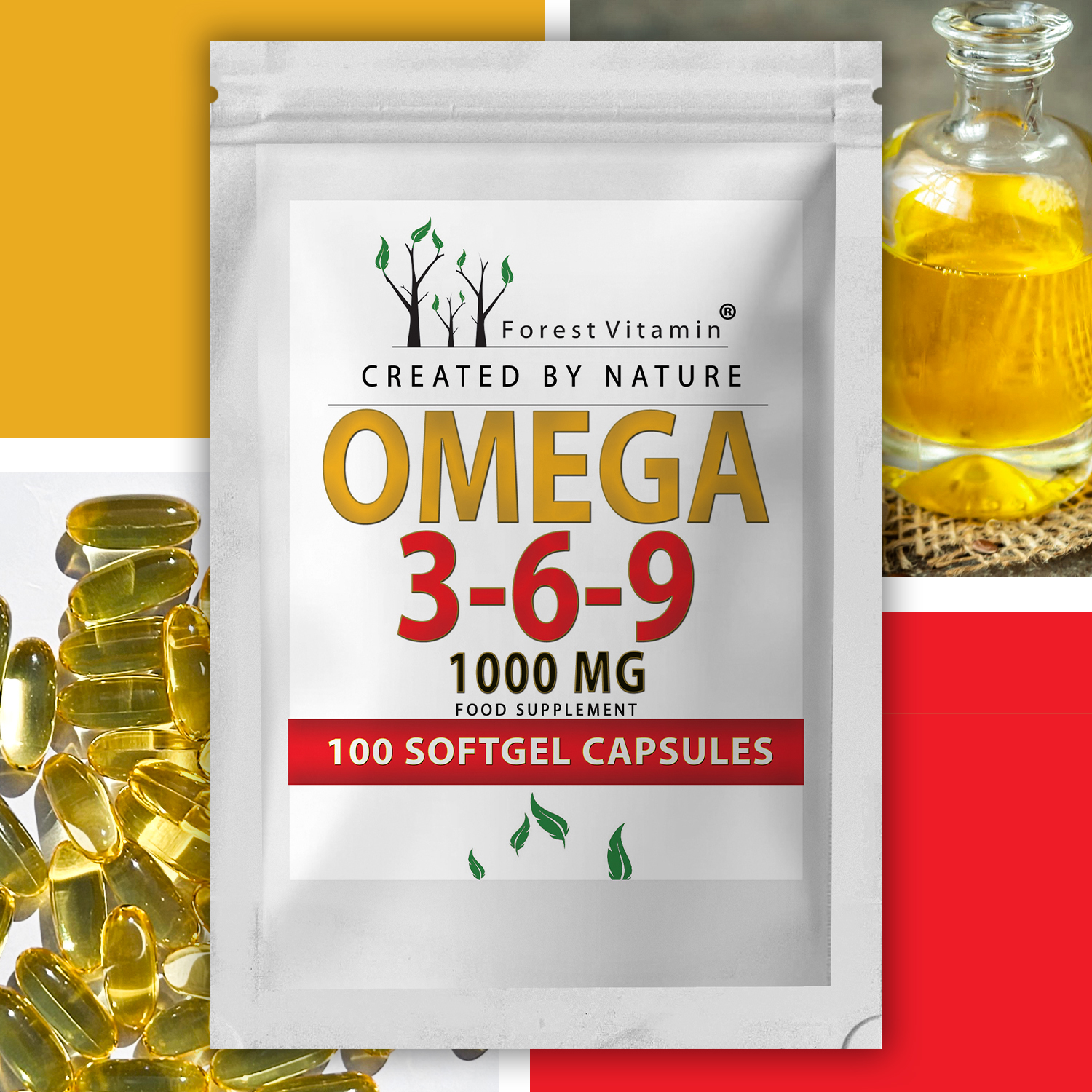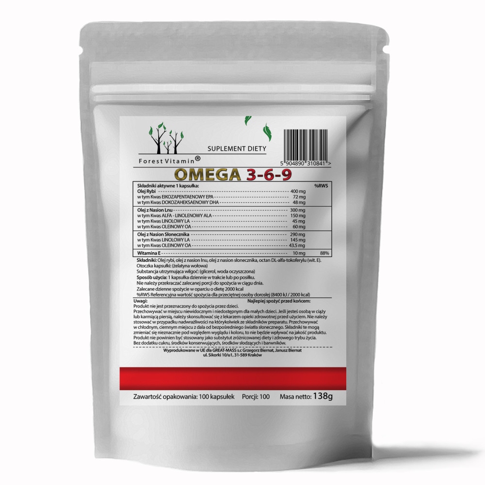 Omega 3-6-9 to suplement diety w kapsułkach żelowych, który dostarcza organizmowi połączenie trzech rodzajów kwasów tłuszczowych: omega-3, omega-6 i omega-9. Produkt łączy w sobie źródła naturalnych lipidów – olej rybi, olej lniany oraz olej z nasion słonecznika. Dodatkowo wzbogacono go o witaminę E, znaną z właściwości przeciwutleniających. Dzięki takiej kompozycji preparat może stanowić uzupełnienie codziennej diety osób, które chcą zadbać o dostarczanie organizmowi kwasów tłuszczowych w zbilansowanej formie.