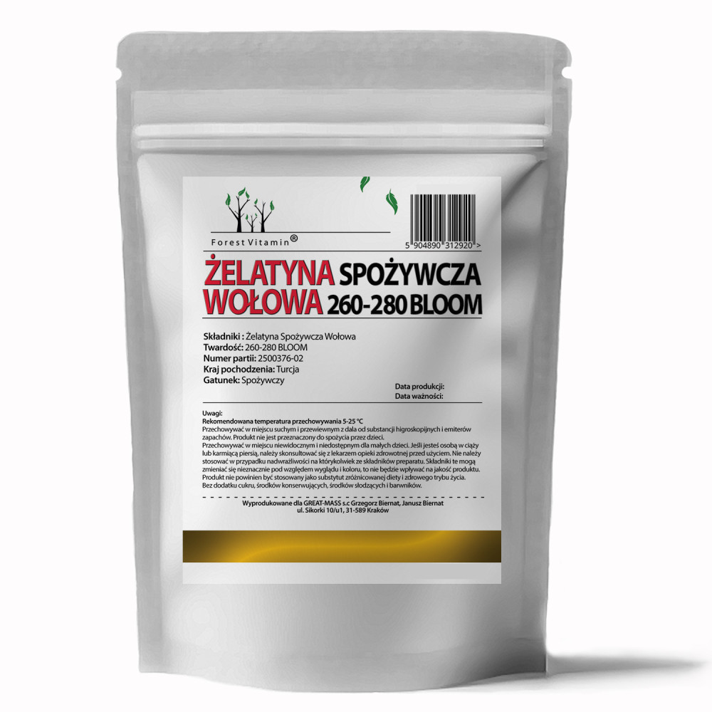 Żelatyna wołowa to naturalne źródło białka kolagenowego, niezbędnego do utrzymania elastyczności i wytrzymałości tkanek. Produkt ma szerokie zastosowanie w kuchni, dietetyce oraz przemyśle spożywczym. Dzięki wysokiej jakości i sile żelowania 260–280 Bloom, gwarantuje doskonałe efekty w deserach, galaretkach, ciastach, a także w produktach wysokobiałkowych.