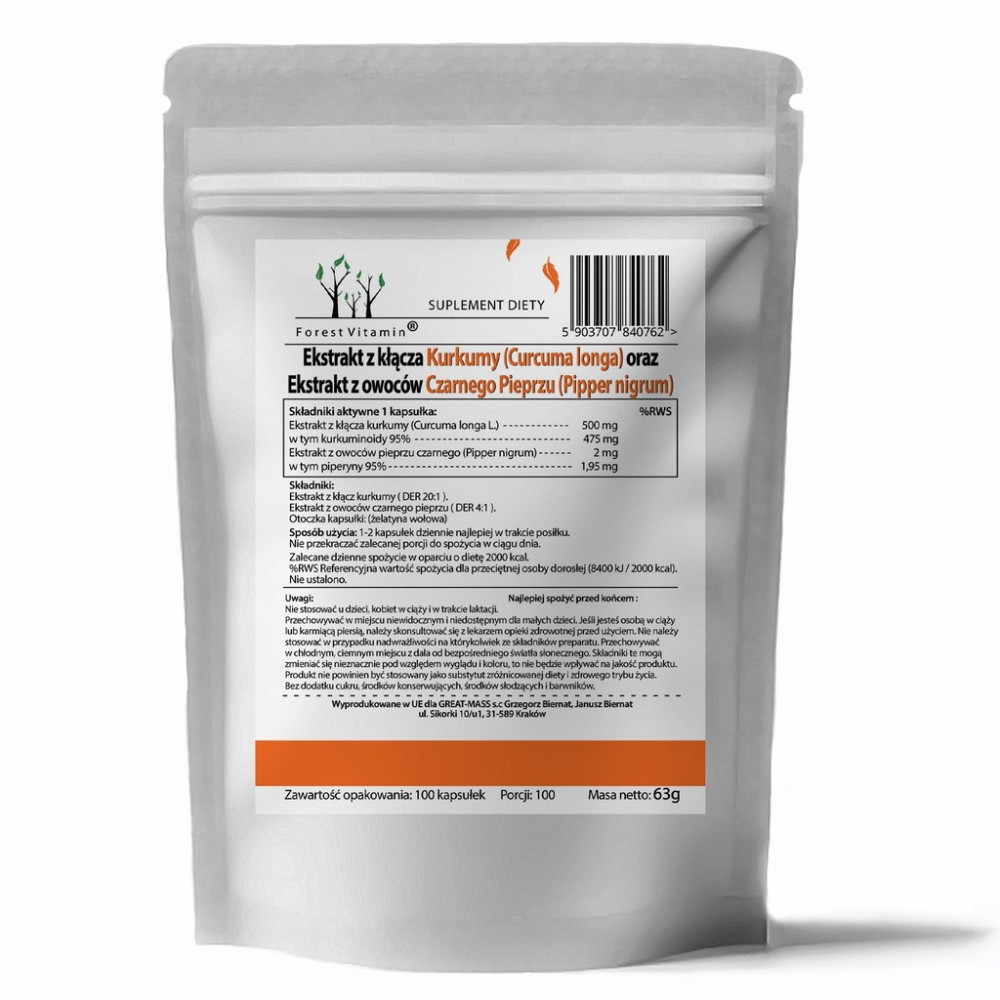 Nasz suplement diety zawiera najwyższej jakości ekstrakt z kurkumy oraz czarnego pieprzu, który jest naturalnym źródłem piperyny – składnika wspomagającego wchłanianie kurkuminy.