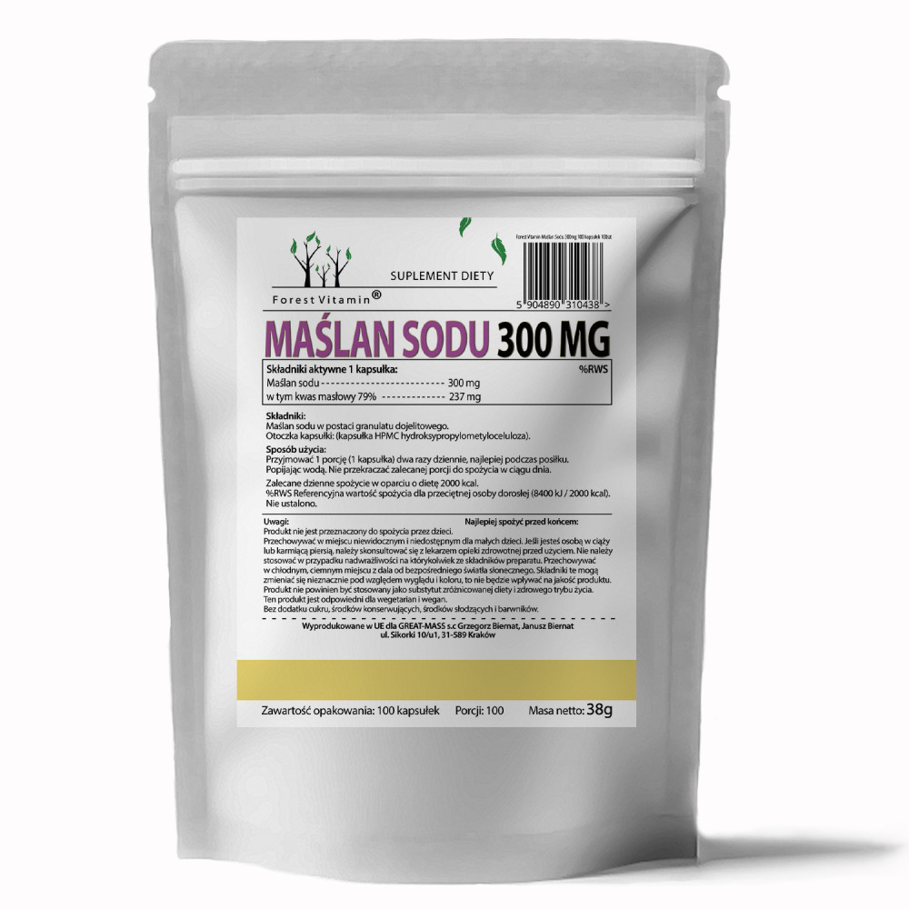 Maślan sodu, czyli kwas masłowy należy do grupy krótkołańcuchowych kwasów tłuszczowych, które są głównym źródłem energii dla kolonocytów, czyli komórek nabłonka jelit. Wspomaga tworzenie przyjaznych bakterii, które wzmacniają probiotyki. Wspomaga detoksykację i utratę wagi. Maślan pomaga oczyścić pęcherzyk żółciowy i drogi żółciowe. Jest również przyjazna dla diety ketonowej i wspomaga usuwanie zbędnych tłuszczów, które gromadzą się wraz z wiekiem oraz zwiększa produkcję leptyny, aby wspierać zdrową utratę wagi. Maślan sodu jest stopniowo uwalniany dzięki czemu proces odbywa się na całej długości jelita cienkiego i grubego.